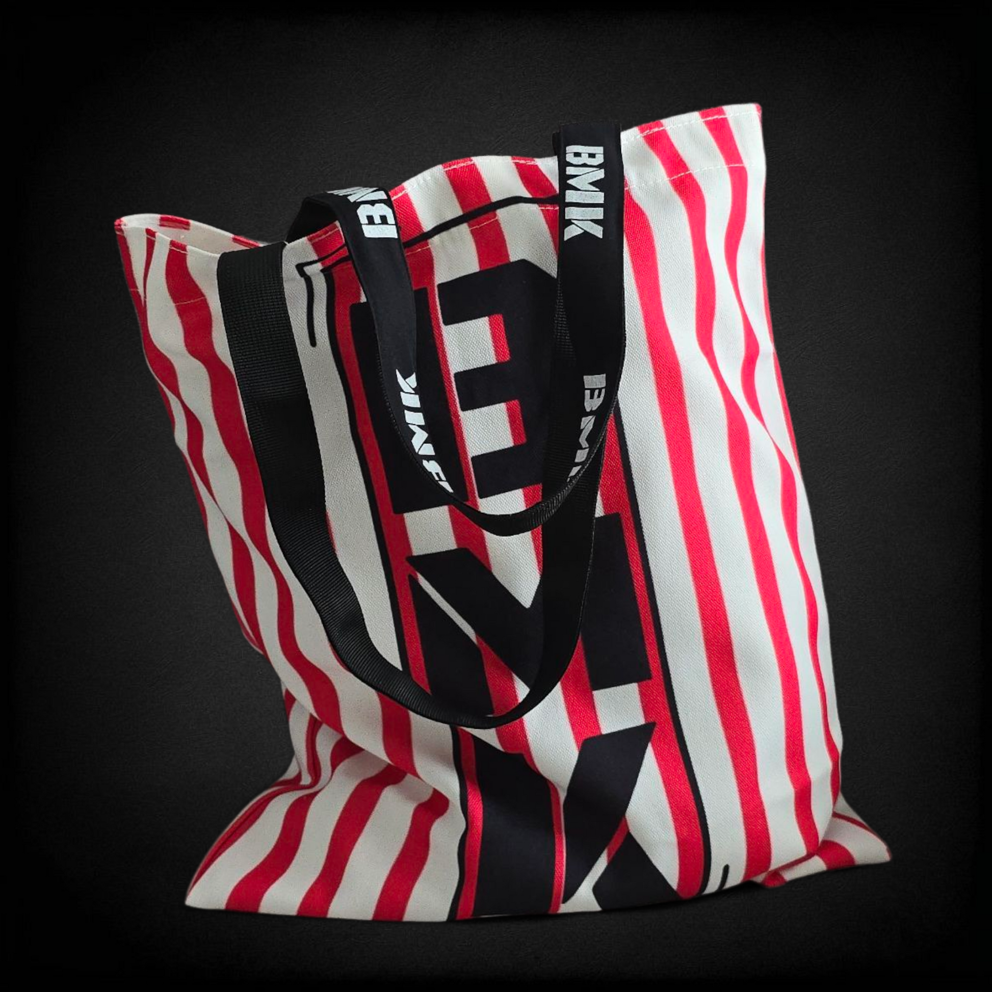 Ova stylish tote bag dimenzija 35 × 40 cm izrađena je od čvrstog tkanog platna, idealna za sve prigode. Crno-bijeli print prekriva cijelu torbu, dok se u središtu ističe crveni "BMK" logo.