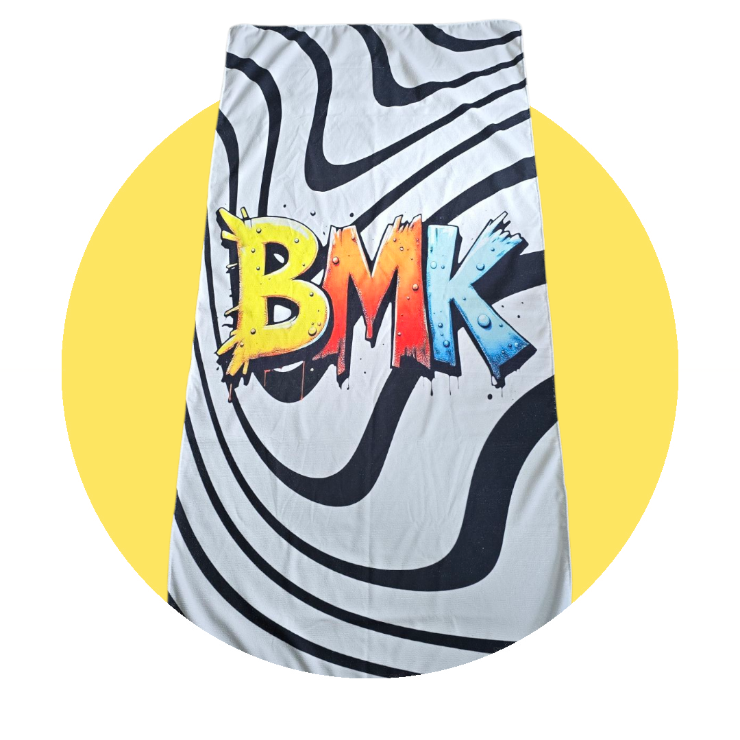 Veseli natpis "BMK" daje ručniku jedinstvenost i prepoznatljivost. Idealan je za ljude koji ne koriste klasične prostirke, ali žele udobnost i poruku na plaži.